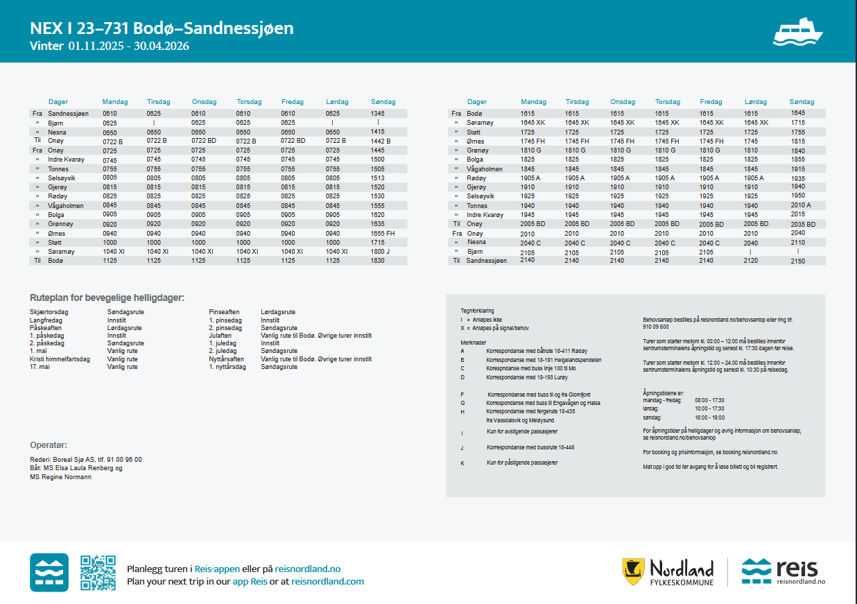 Lenker til Reis Nordland, Torghatten Nord og Boreals hjemmesider. Her finner du oppdaterte båtruter og eventuelle ruteavvik: