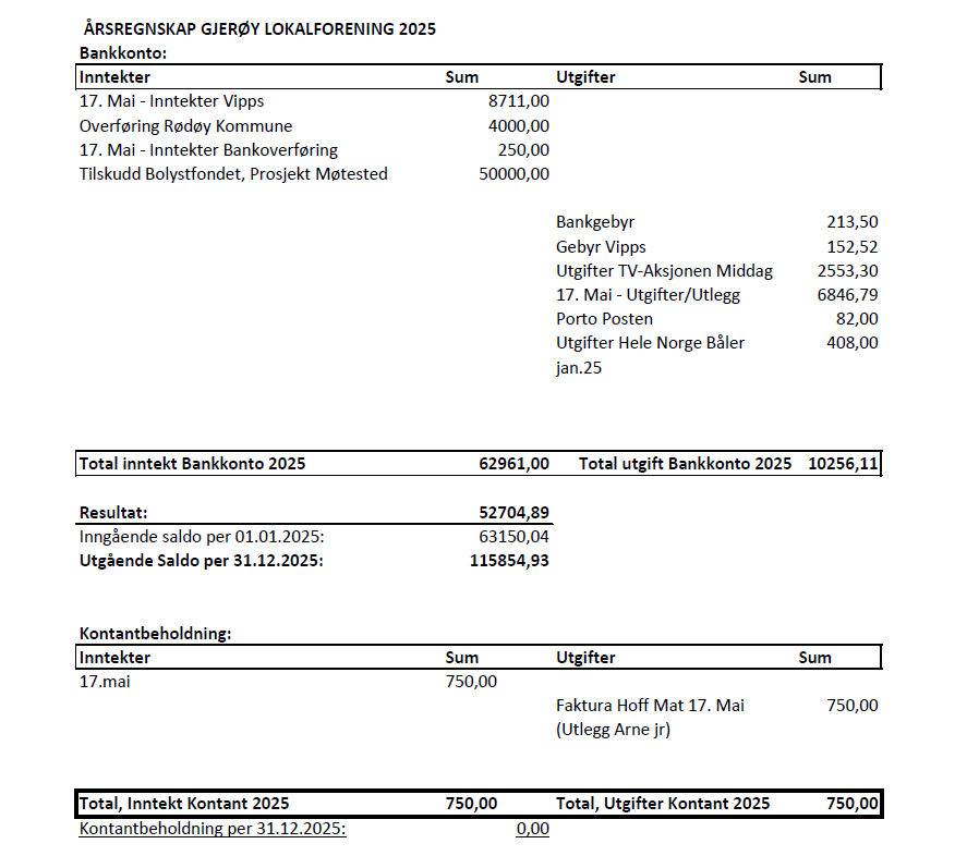 Årsmøte Gjerøy Lokalforening 7.4.2025; Innkalling, Møtereferat, Årsmelding, Regnskap for år 2024 og valgprotokoll 2025: